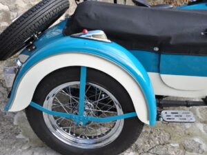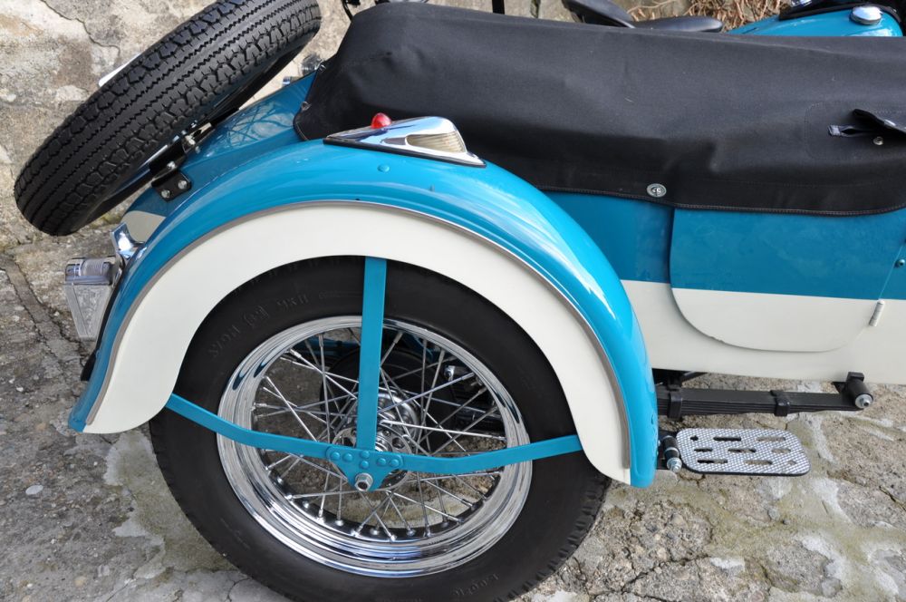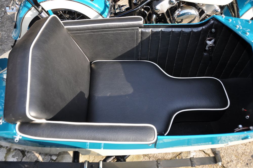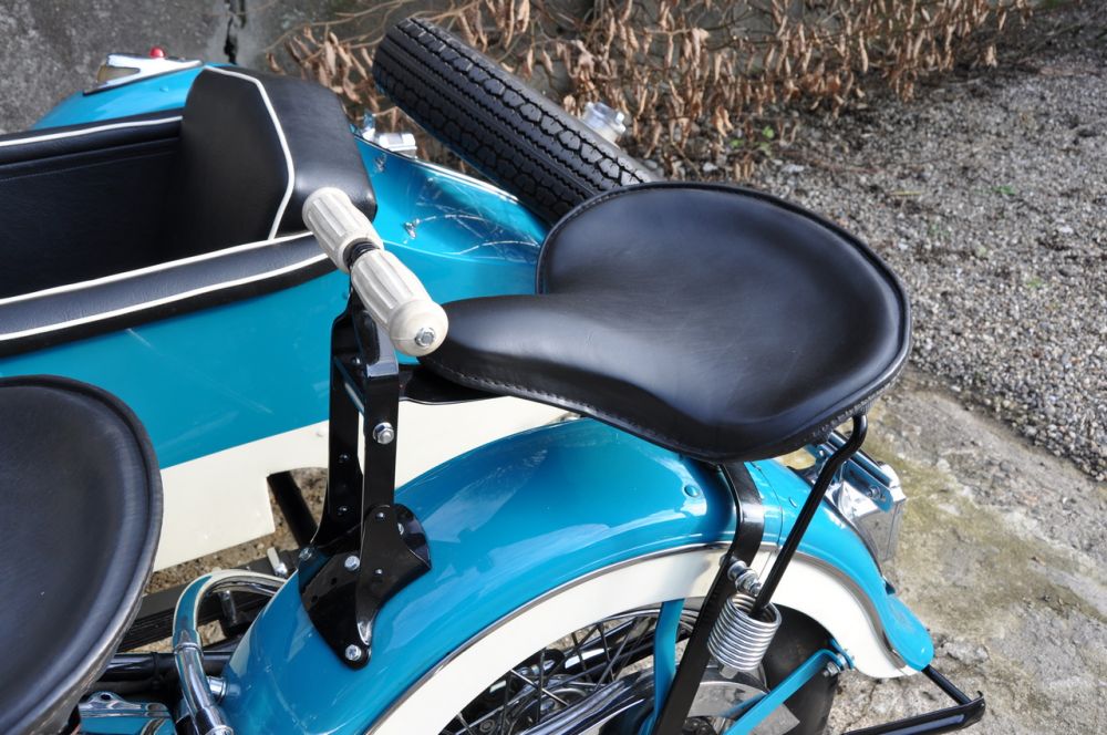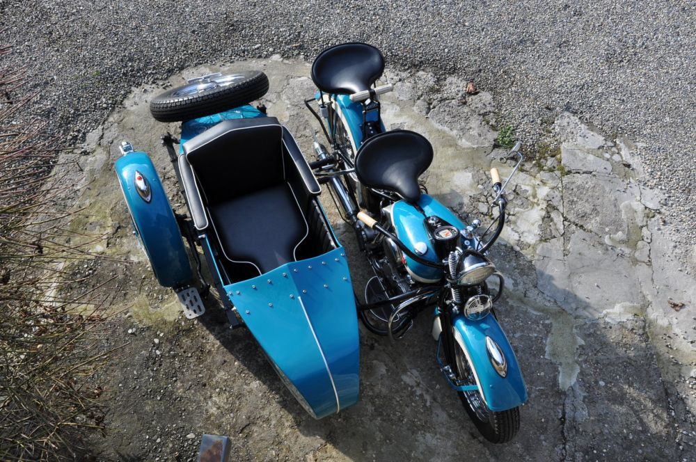 Der Seitenwagen kann mit wenigen Handgriffen und innert kurzer Zeit demontiert werden. Sitz im Seitenwagen wurde mit zwei Sicherheitsgurten nachgerüstet für Erachsene und Kinder.