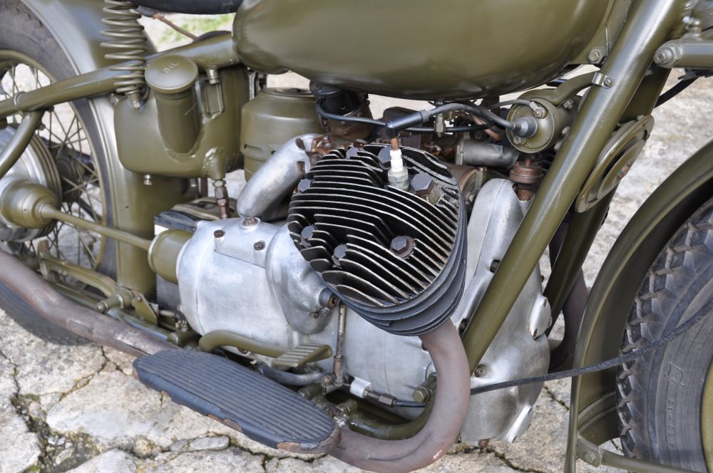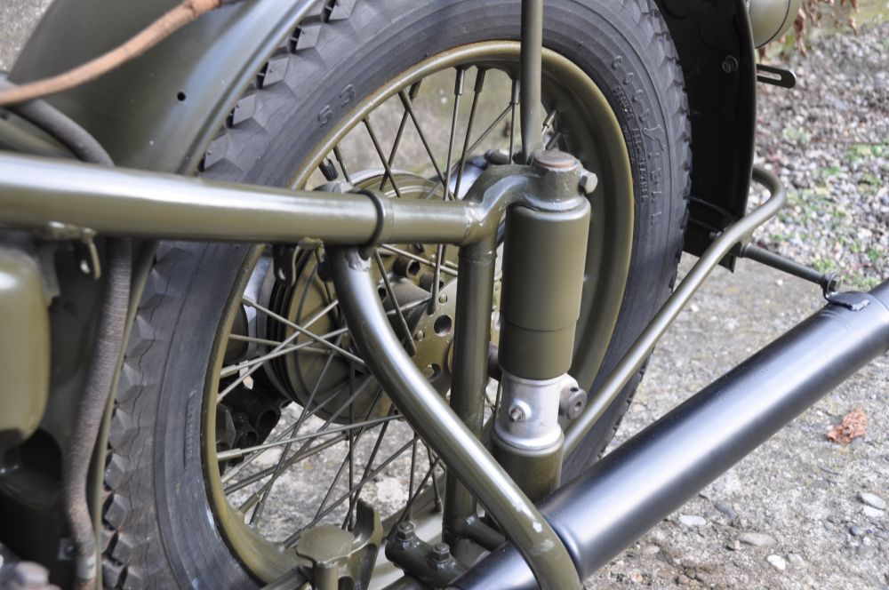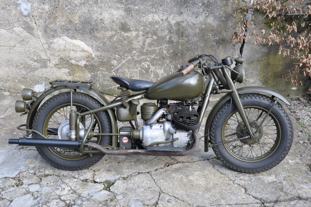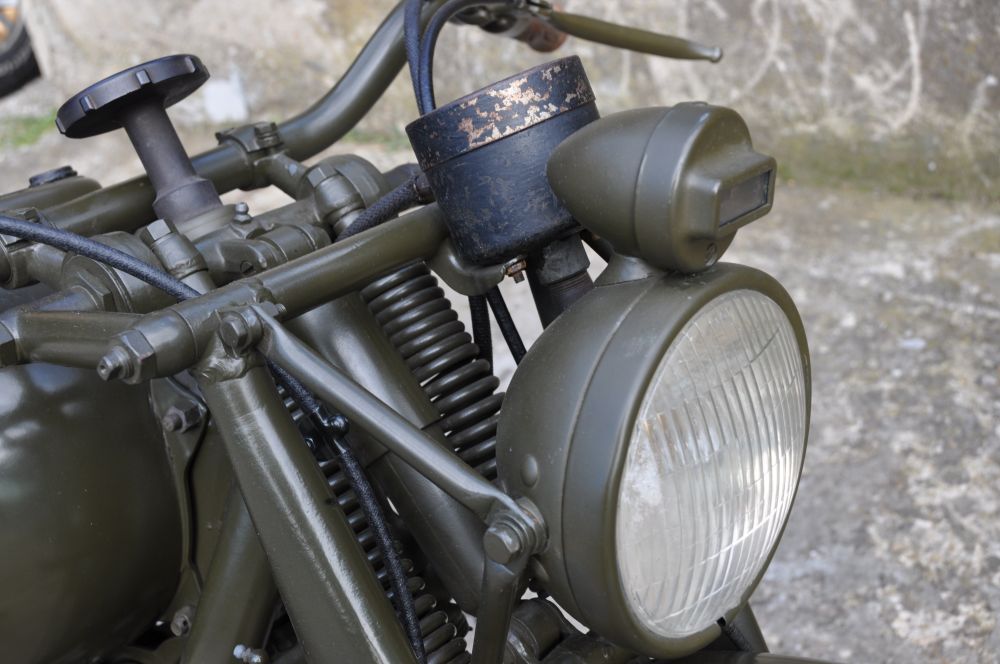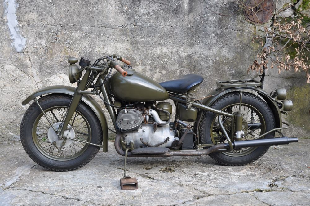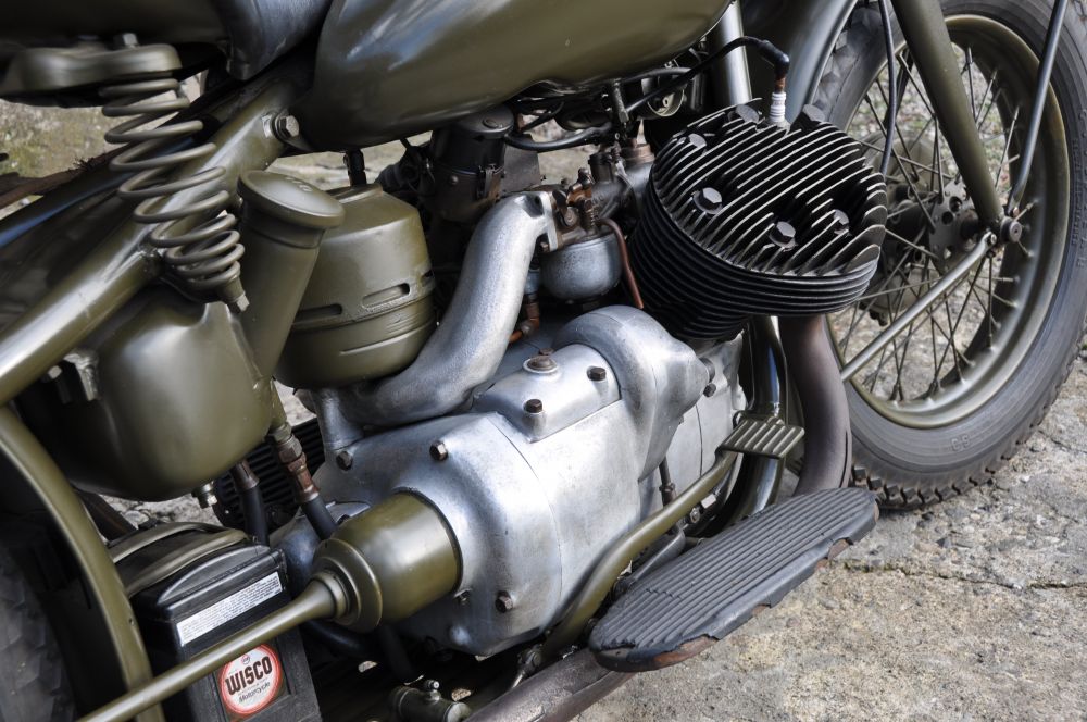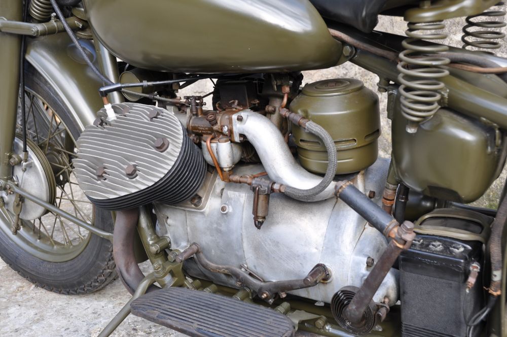Eine Rarität und vermutlich die einzige in der Schweiz. Die US-Army erbat von Indian und Harley-Davidson eine Kardanmaschine für den Einsatz in der nordafrikanischen Wüste zu bauen. Harley wandte sich in Richtung des Feindes, um Ideen zu bekommen. Die BMW R11 wurde tatsächlich kopiert. Indian aber baute eine total neue Konstruktion, das Modell 841, ein ungewöhnliches Motorrad. Der Zweizylinder V-Motor wurde quer eingebaut. Einige Motorenteile stammten von der 750er Sport Scout, und zum ersten Mal ging Indian zur Fussschaltung über. Es war so geplant, das die bessere der Maschinen in grosser Stückzahl von der Armee bestellt werden sollte. Weder die XA von Harley noch die 841 von Indian entsprachen den Vorstellungen der US-Army, welche stattdessen den Willys-Jeep als Frontfahrzeug bevorzugte. Einige Details aus der 841er Entwicklung flossen bei den Nachkriegs-Serienmodellen ein. So zum Beispiel: Gummilagerung für den Lenker, die Vorderradgabel sowie die Radnaben und Bremsen. Die meisten dieser wenig produzierten 841er Indian wurden nach dem Krieg auf „zivil“ umgebaut und lackiert. Die 841er im ursprünglichen Militärtrimm sind eine Seltenheit. Weitere Auskünfte und Preisangaben bei uns im Geschäft bei einer Besichtigung.