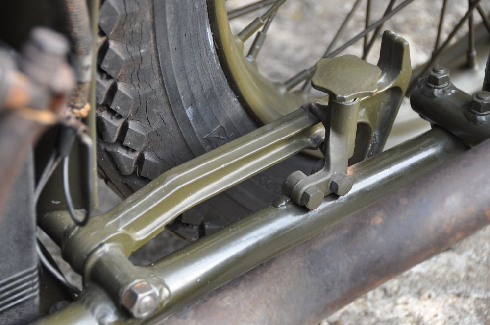 INDIAN 841, US-Army (Prototyp), Hubraum 750 ccm, Leistung 23 PS, Baujahr 1942 Getriebe 4-Gang mit Kardanantrieb, Rohrrahmen gefedert, Girdergabel mit Stossdämpfer. Quer eingebauter V-Motor und Kardanantrieb.
