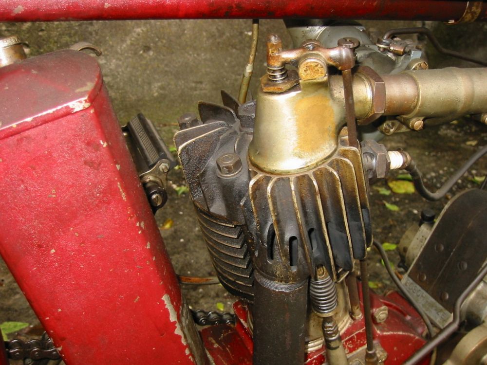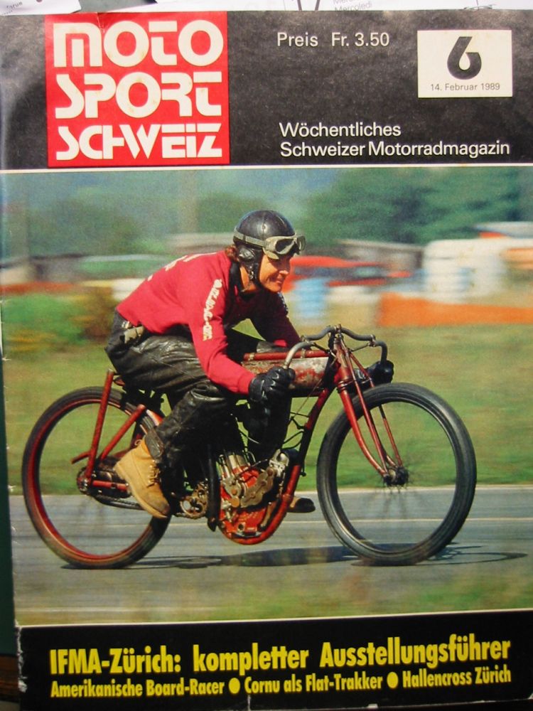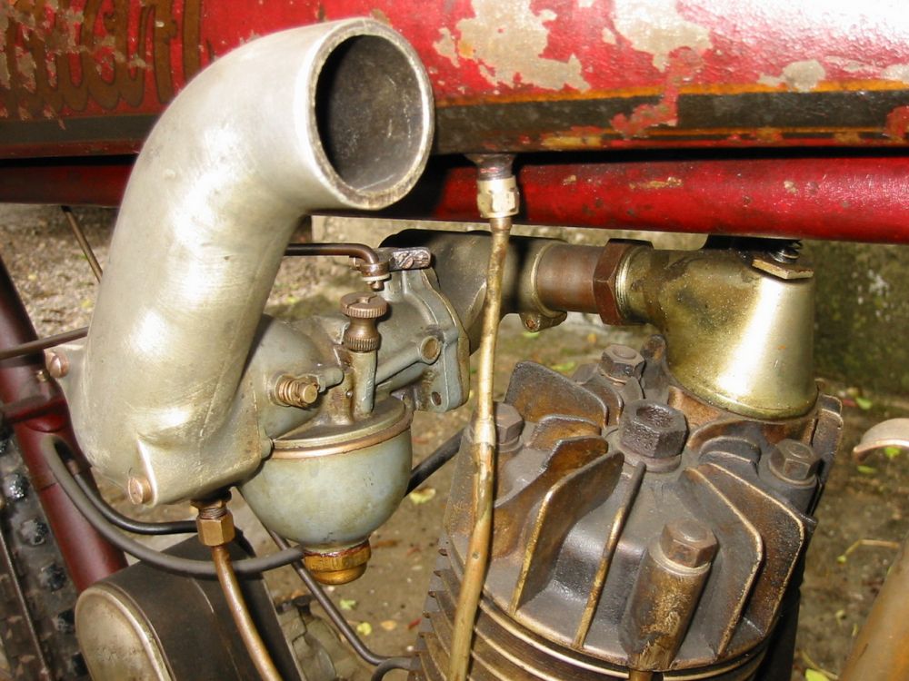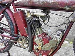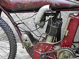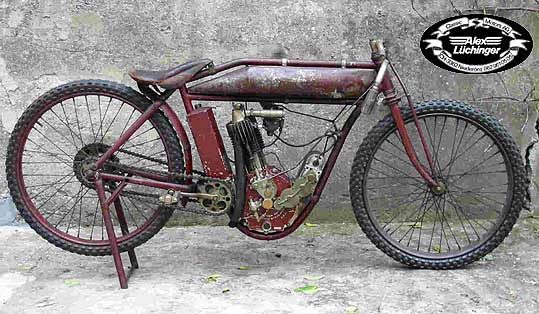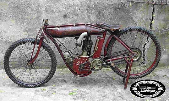 Indian Track Racer gab es mit 500 ccm Einzylinder und 1000 ccm V2 Motoren. Sie haben keine Kupplung, kein Getriebe, keine Federung, keine Bremsen. Unter den Kühlrippen gegen hinten erkennt man die zusätzlichen Auslassöffnungen, um die Auspuffgase schneller abführen zu können. Vergaser, Zündverstellung und Dekompressor wurden mit den Drehgriffen über kardanische Gestänge und Gelenke gesteuert, da Mr. Bowden seine Bowdenzüge (Kabelzüge) noch nicht erfunden hatte! Diese IOE Indian Track Racer ist in 100% Originalzustand und fahrtüchtig mit Erstlackierung. Sogar die schräg abgefahrenen Reifen vom letzten Track Rennen vor über 100 Jahren sind noch montiert!